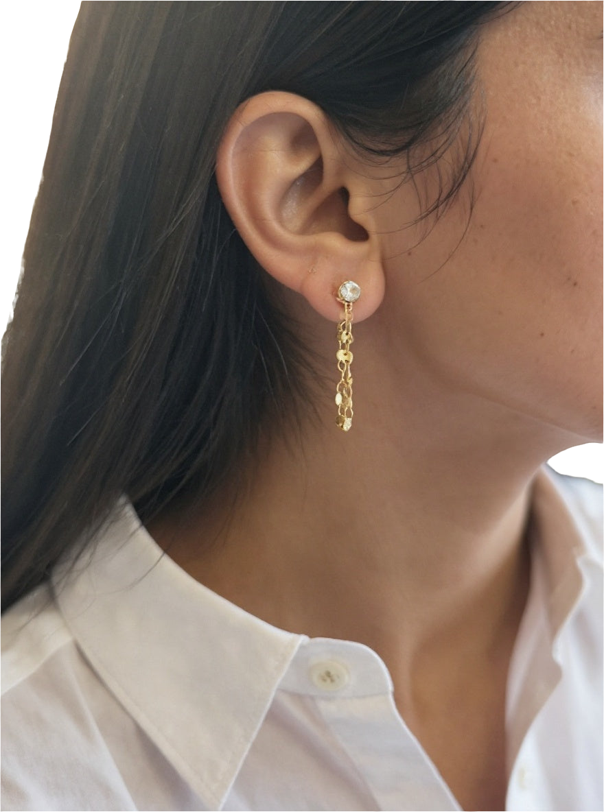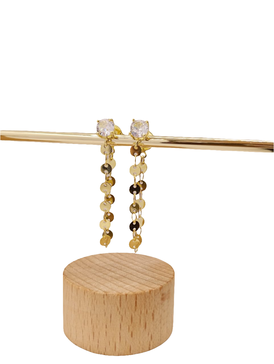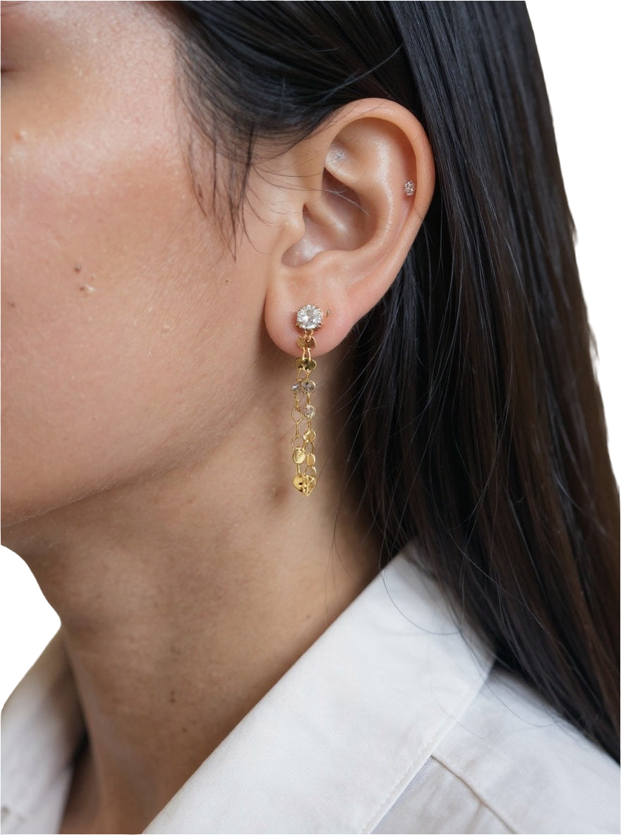 Aros alargados con doble cadeneta y circón. Enchapados en oro 18k.