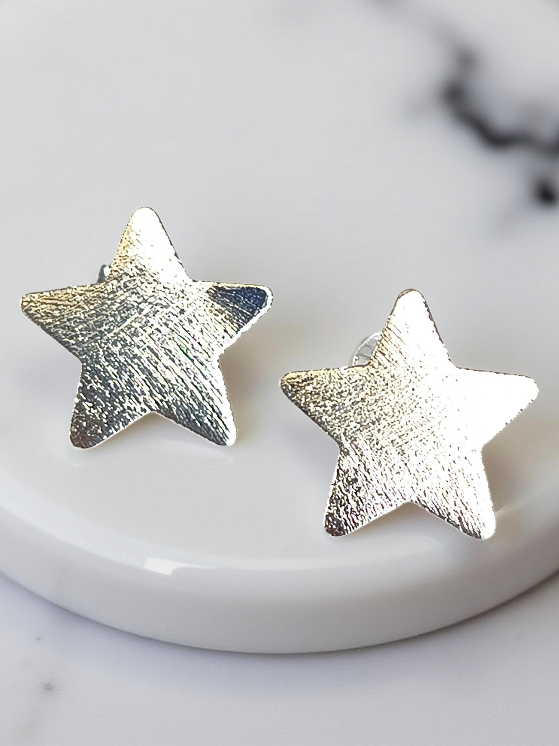Aros de estrellas lijadas 1.5cm de diámetro, enchapados en plata 925 y libres de niquel.