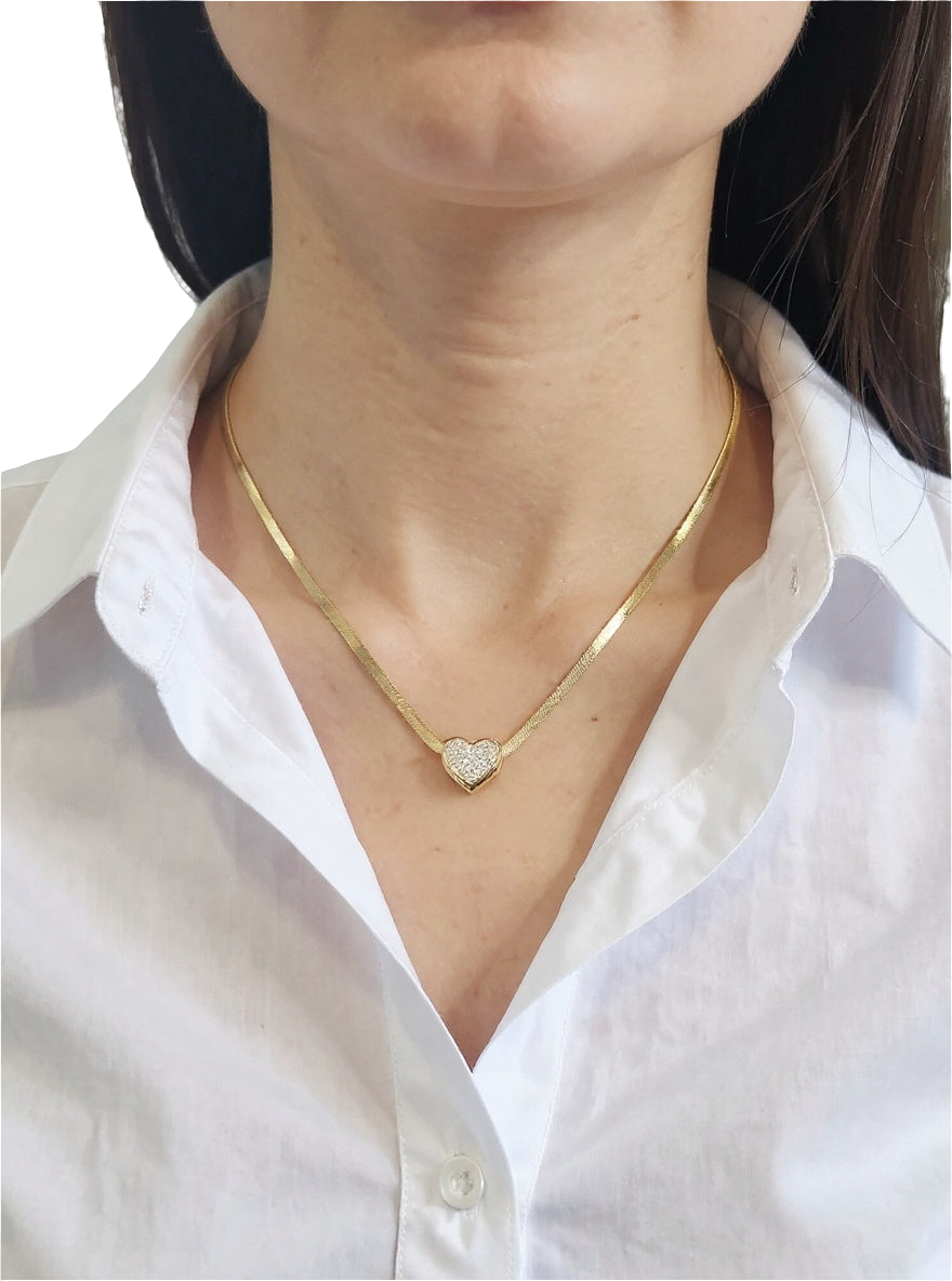 Collar tipo cinta con corazón detalles con microcircones enchapado en oro 18k. Libre de niquel.