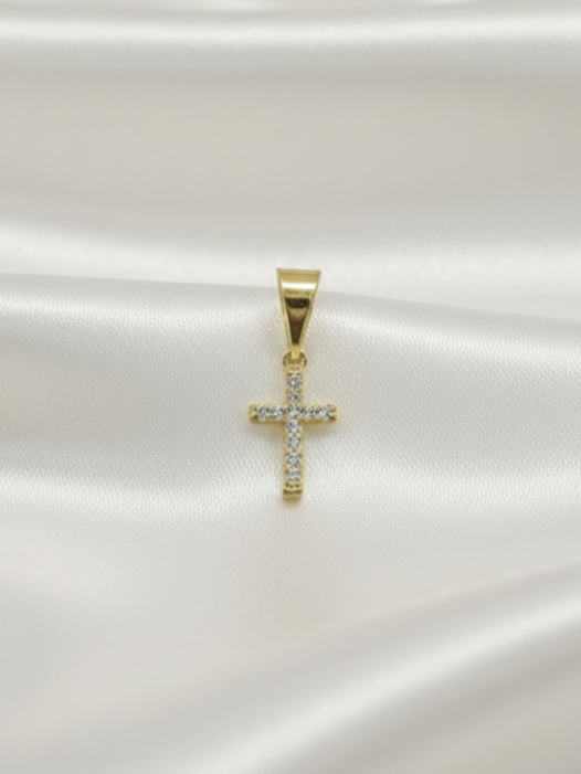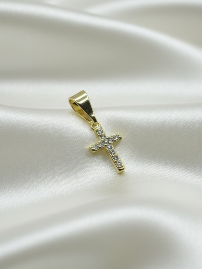 Cruz chica (10mm) con microcircones, enchapada en oro.